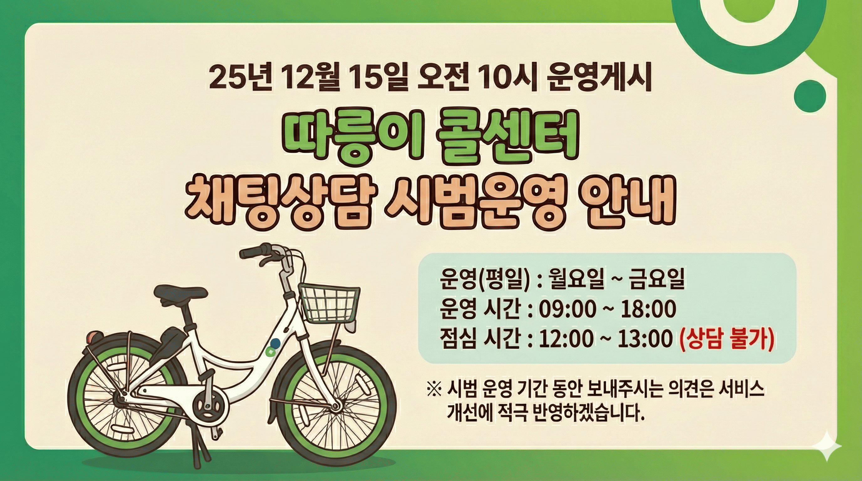 따릉이 이용자 편의를 위해 따릉이 콜센터에서 12월 15일(월) 오전 10시부터 채팅상담 서비스를 시범 운영할 예정입니다.